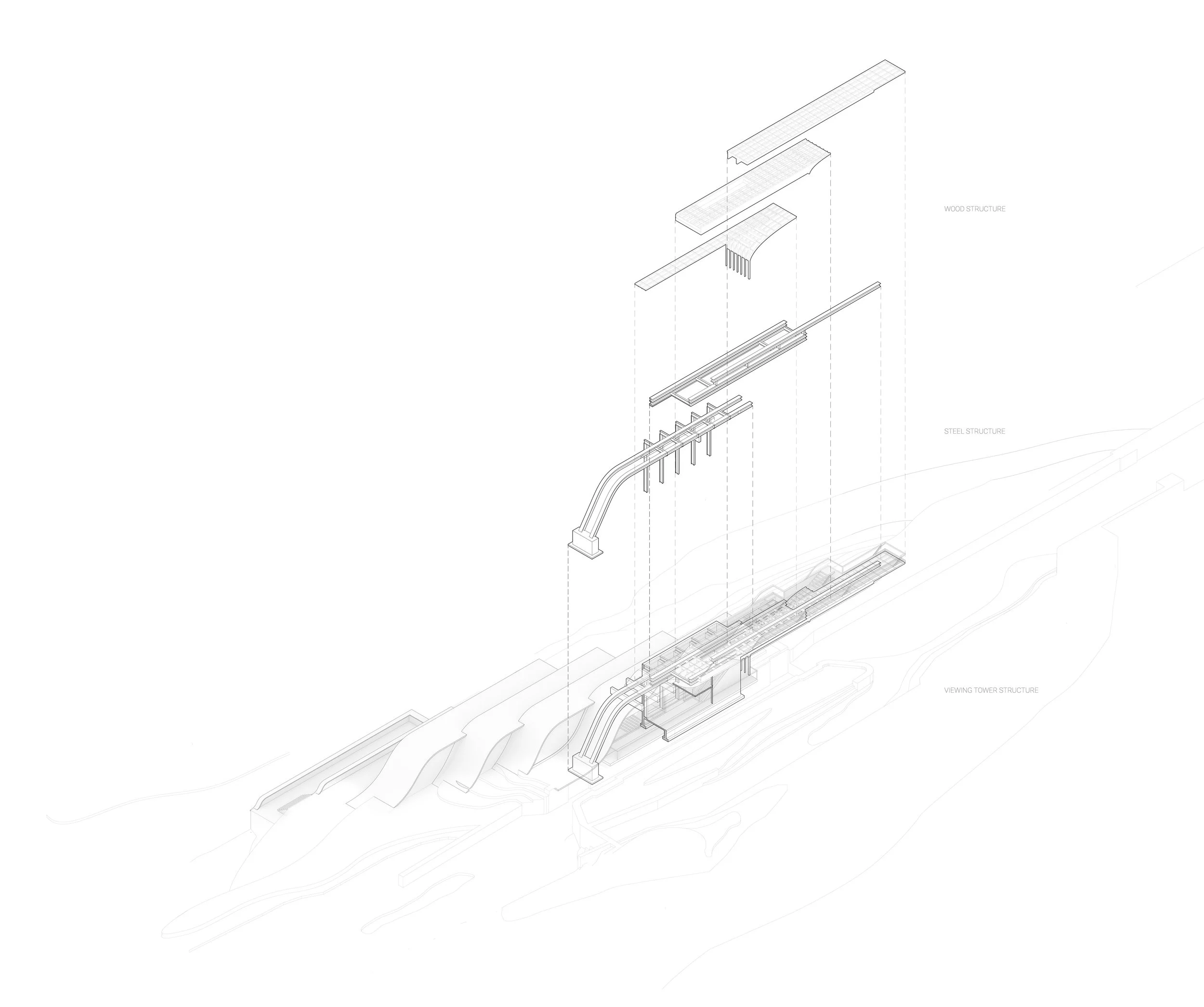 The ‘lookout tower’ exists as a partially sculptural attachment to the visiting center, continuing the shifting and staggering formal language above the canal. The idea was for the lookout tower to look light, elegant, and fit the texture and materiality of the treeline beyond the canal. However, in order to support such a massive cantilever, the tower needed a hidden steel beam system that extended to the foundation.